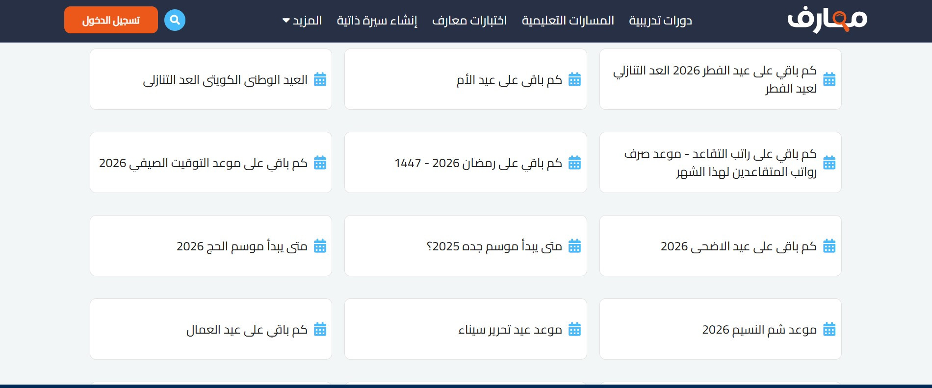 تقدم معارف مؤقت إلكتروني حصري لمعرفة كم الباقي على كافة المناسبات القادمة، يمكنك الدخول إلى الأحداث القادمة والموجودة في العروض والأقسام اسفل الصفحة الرئيسية واطلع على مواعيد كافة احداثك القادمة والمناسبات والأعياد والمعارض والمؤتمرات الدولية لحظة بلحظة